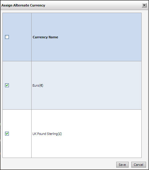 11 Supported Alternate Currencies: Click Assign/Edit Currencies to open the Assign Alternate Currency window.