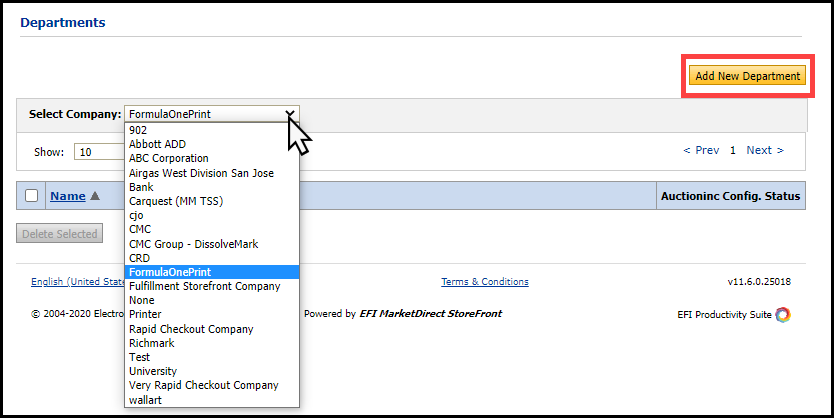 The Departments page is used to add, remove, or update information about designated sub-units of companies whose employees use your MarketDirect StoreFront.