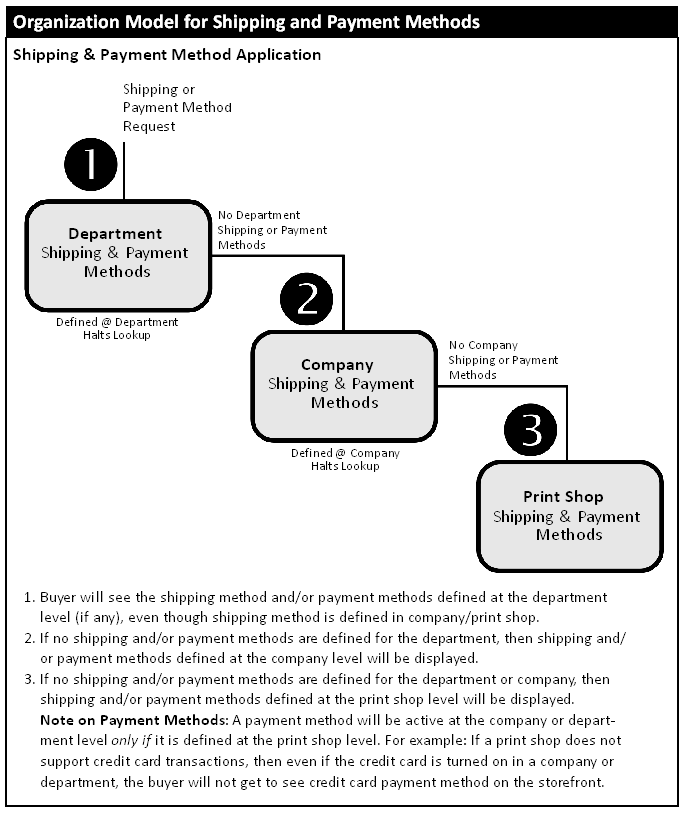 Note: A department automatically inherits all the payment methods of the company unless you specify payment methods at the department level. If you specify payment methods at the department level, only those payment methods will be available for the department (i.e., they will override the company-level payment methods). The payment methods, however, must be enabled at the Print Shop-level. See the "MarketDirect StoreFront Organization Model for Shipping and Payment Methods" diagram below.