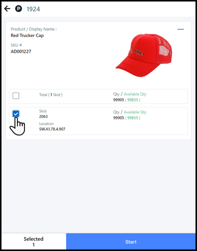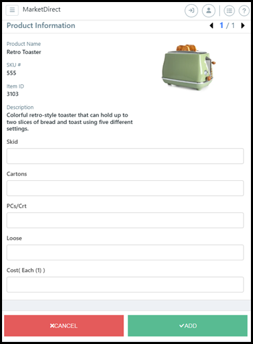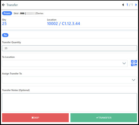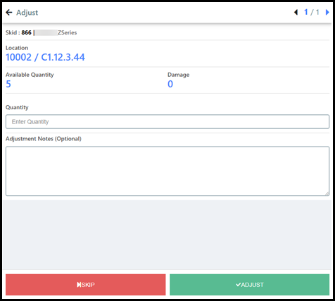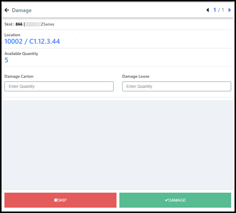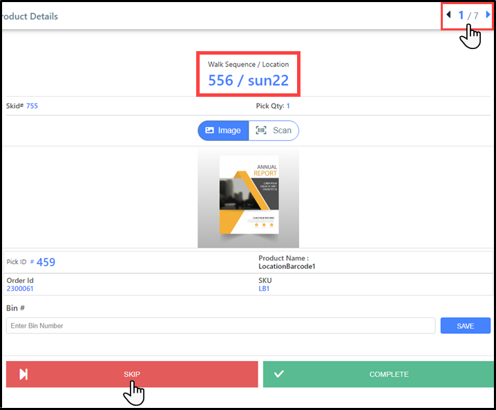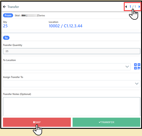 You can navigate through the skids in numerical order by tapping the Skip button to skip the current skid, or tapping the right and left arrows in the Product Details header.