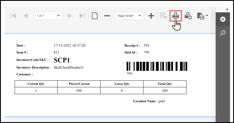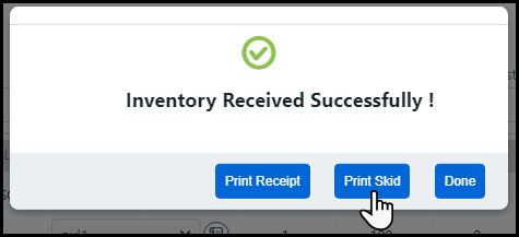● Click the Print Skid button in the Inventory Received Successfully window.
