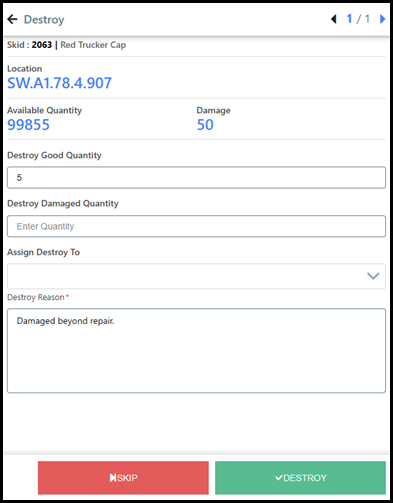 3 Enter the quantity of damaged items on the skid to be destroyed in the Destroy Damaged Quantity field.