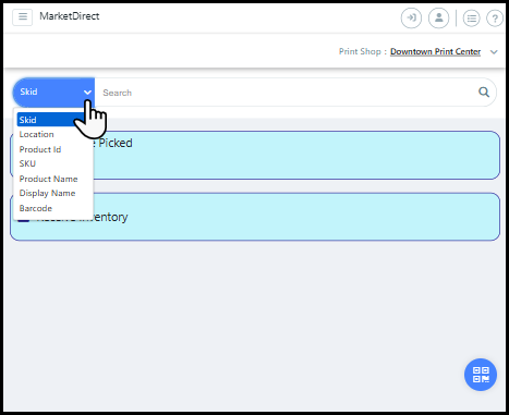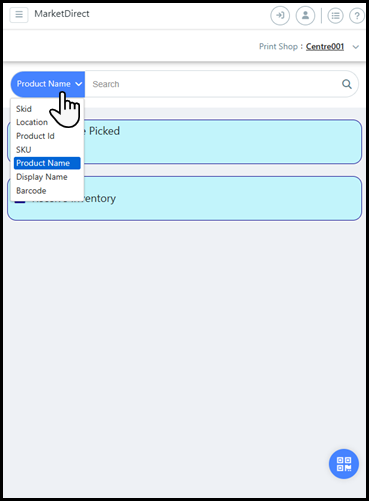 For example, if you want to search for a product based on skid number, select Skid from the Search Filter drop-down list. Filters include Skid, Location, Product ID, SKU, Product Name, Display Name, and Barcode. If you search for an item using the Barcode filter, then you must enter the alpha-numeric value of the barcode into the field.