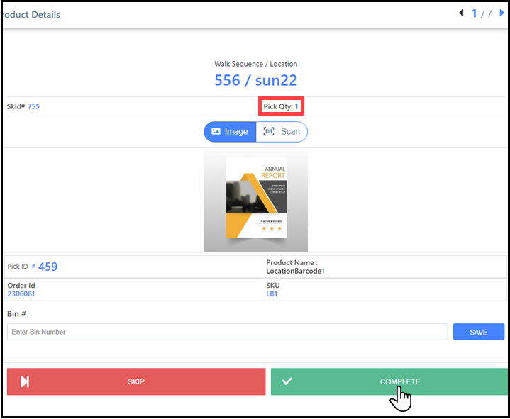 7 If there are multiple items in the order, then the next item to be picked will open. After all items in the order are picked, you will return to the Product pick list.