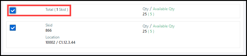 4 Select the inventory from the list you want to Transfer, Adjust, Destroy, or Damage by tapping the check-box next to the skid.
