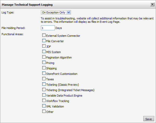 ● Functional Areas: Specify the functional areas of MarketDirect StoreFront to limit the scope of the event logging. For example, if you know that there is an issue (exceptions) with file conversion, you would check the box File Converter to limit the collection of data to exceptions related to file conversion.