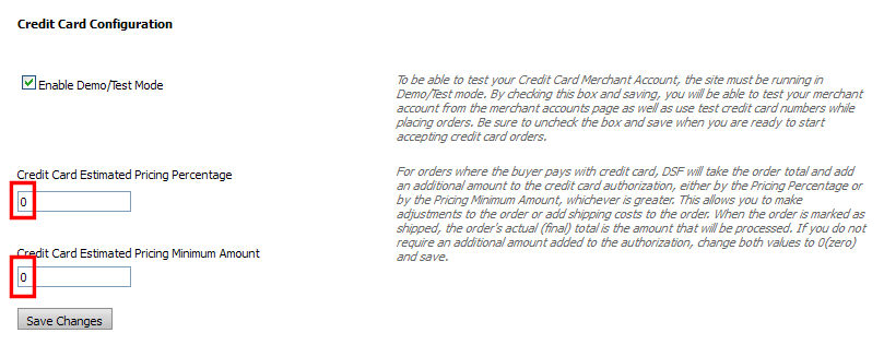 Warning: Be sure to uncheck the Enable Demo/Test Mode box on the Site Settings page and click Save Changes when you are ready to begin accepting credit card orders.