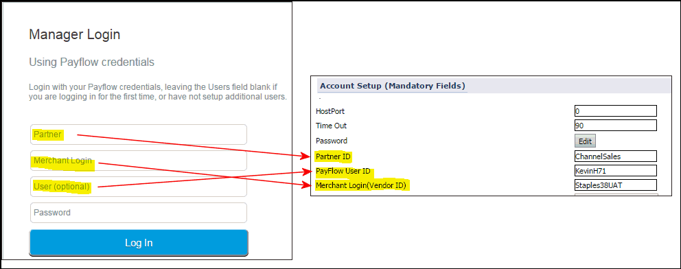 ● (Required) Merchant Login (Vendor ID): Your Vendor ID number, issued by Payflow Pro when you set up your account with Payflow Pro.