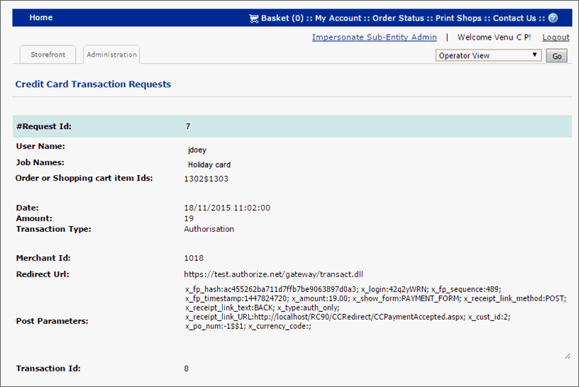 ● On the Administration > Credit Card Management and Configuration > Credit Card Transactions page, view the transaction log: