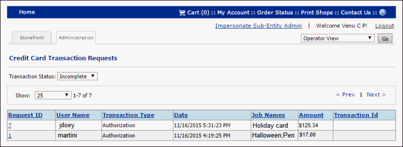 ● On the Administration > Credit Card Management and Configuration > Credit Card Transaction Requests page, view the log of credit card transactions.