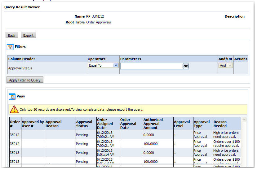 2 Click a link in the Order Number column to access the Approval area on the Order Confirmation page.