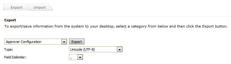 Note that setting approval policies for cost centers and accounting codes must be performed using the Import functionality (using the Approval_Configuration.csv template). For more information, see Set Up Approvers Using the Import Template in this help topic. For more information on the Export / Import functionality, see the help topic Export - Import.