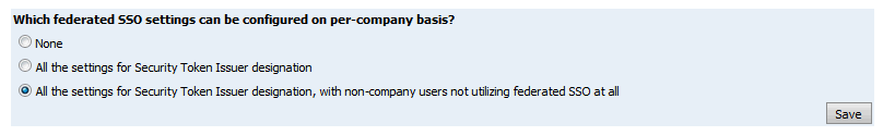 ● All the settings for Security Token Issuer designation, with non-company users not utilizing federated SSO at all: Select this option if you want each company to provide its own settings (i.e., no site-level settings are imposed). Users not associated with a company will not use federated SSO at all. This lets you set up federated SSO for some companies but use internal (forms) authentication for others (requiring entry of user name and password).