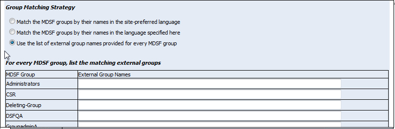 ● Match the MDSF groups by their names in the site-preferred language: Choose this option to have the MarketDirect StoreFront user groups mapped by their names in the default language for the site.