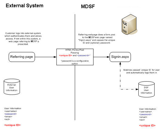 The data structure storing user information in MarketDirect StoreFront now includes a Login Bypass Unique ID field. This field can contain a unique ID value that matches a unique ID value in the customer’s user database(s). When this ID is passed (via form post) to a special MarketDirect StoreFront page (signin.aspx), MarketDirect StoreFront matches the ID to the field in the MarketDirect StoreFront user table and logs in as that user. In addition, the password can be required for an additional level of security. This requirement is configured by setting the PermitEmptyPasswordSSO field in the Web.config file.