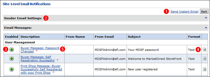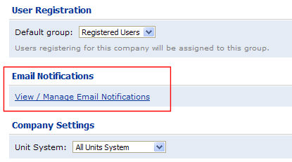 Email notifications exist at two levels in MarketDirect StoreFront—at the site level and at the company level. You will access the Company-Level Email Notifications page from the Manage Company page.