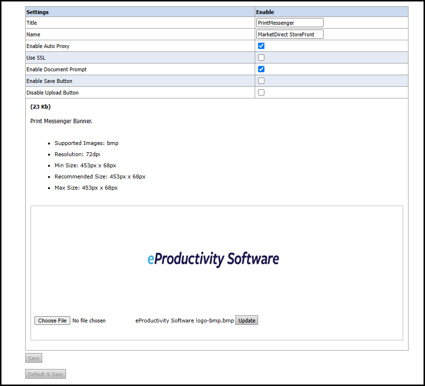 Click Default & Save to revert to the Windows PrintMessenger's default banner and configuration settings that shipped with MarketDirect StoreFront.