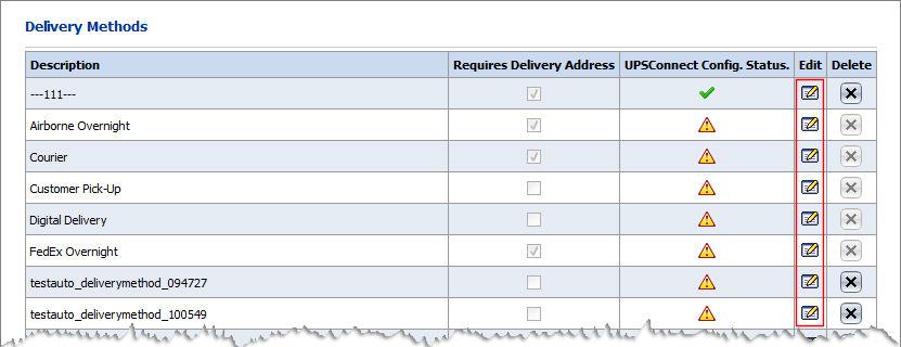 ● To configure ExpressRater for any of the delivery methods listed, click the Edit icon in the Delivery Methods table.
