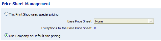 ● If you do not want to use special pricing for this Print Shop, select Use Company or Default site pricing. This will cause the system to use the price sheet for the company or, if no special pricing is selected at the Company level, to use the default site price sheet.