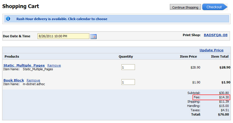 ● Force user selection of date in calendar—This option requires the buyer to select a due date on the calendar before proceeding with checkout. This option lets buyers see the turnaround time for each product (e.g., in a multi-product order) and then choose whether to accept the default date calculated (based on the turnaround time you specified in the Turnaround Time field on the Settings tab of the Manage Products page) or to specify an earlier date on the calendar and see the applicable rush hour charges for expediting the order.