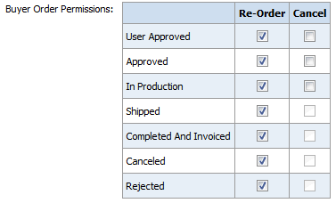 12 Buyer Order Permissions—Buyer order permission settings let you specify the conditions under which buyers who purchase products from the Print Shop will be able to re-order products or cancel orders from their Order History & Status page on the buyer side. The column on the left is the order status.