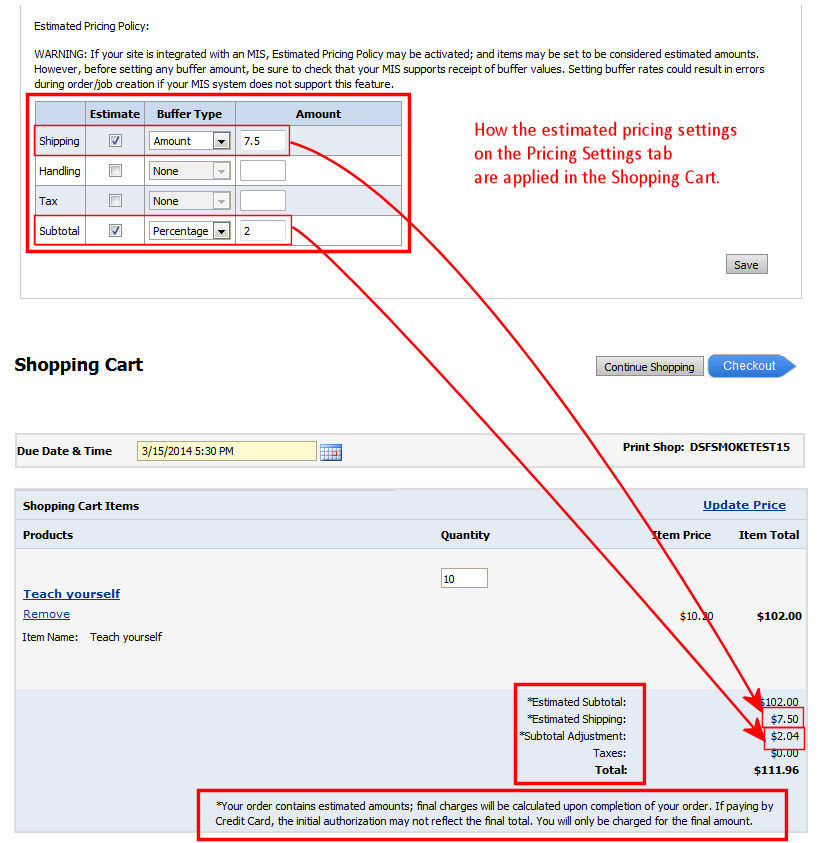 For sites integrated with an MIS: If you want to use the estimated pricing feature, make sure that your MIS supports receiving buffer values. If it does not, do not use estimated pricing because doing so could result in errors during the order process.
