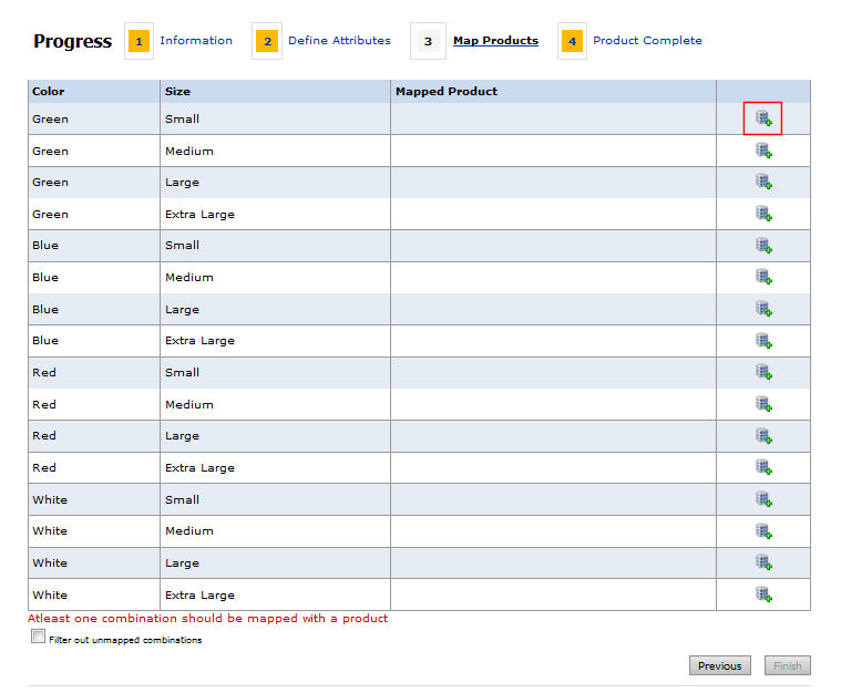 (2) Create a product for each variation of the product you want to offer (e.g., a small blue T-shirt, a medium blue T-shirt, a large blue T-shirt, etc.) selecting the appropriate attributes and map each attribute to the appropriate variation product.