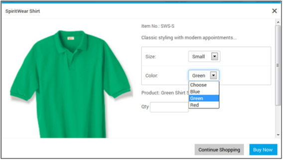 A matrix product is a composite product (which, like a kit product, is a product composed of two or more other products) that combines two or more related products into a single product with various options so that buyers have a convenient way of choosing the options they want. For example, say you offer a spirit-wear T-shirt in three colors (red, blue, and green) and 4 sizes (small, medium, large, and extra large). Instead of publishing each variation (e.g., a small red shirt, a small blue shirt, etc.) as a separate product on the storefront, when you create a matrix product, you will publish one product on the storefront (e.g., "SpiritWear T-Shirt") and buyers will be able to select the color and size they want from pull-down lists.