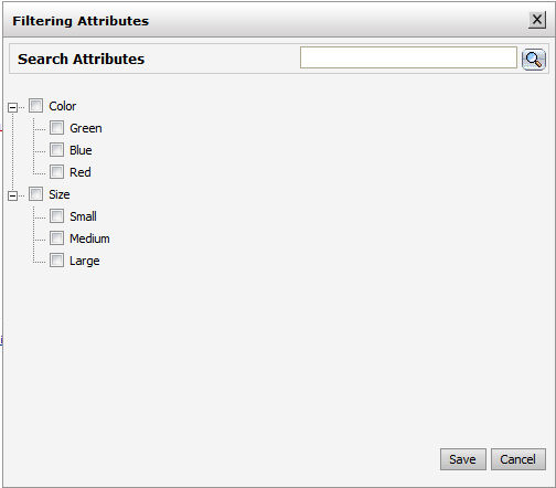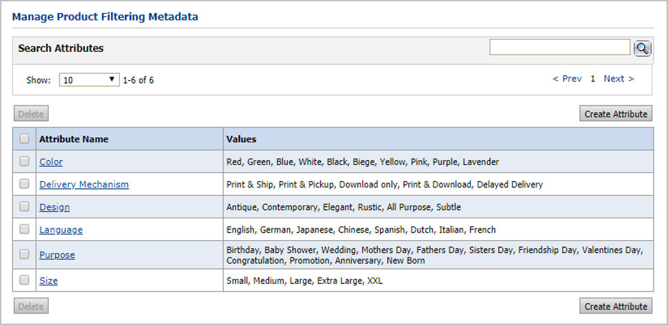 (1) Create a matrix of attributes (product filtering metadata) that defines all attributes to use in your products such as size (e.g., small, medium, large, extra large) and color (e.g., red, white, blue) on the Manage Product Filtering Metadata page.