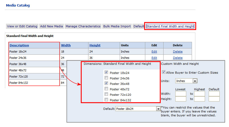 1 On the Media Catalog > Standard Final Width and Height tab configure the final width and height using the fields below.