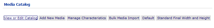 The Media Catalog has six tabs, each of which lets you manage a different aspect of Media in MarketDirect StoreFront. Click on a bordered tab on the image below to open the Help topic for that tab.