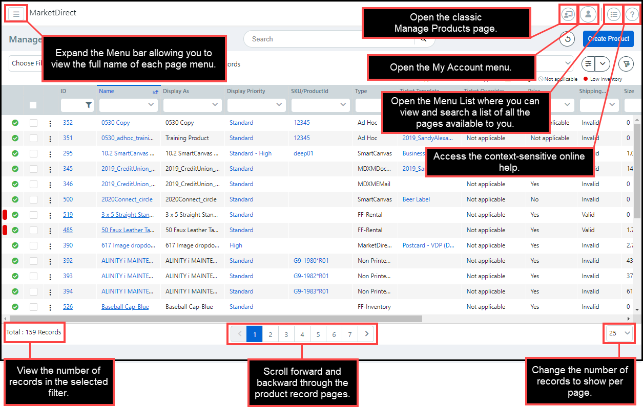 ● The image below shows the Manage Products page (completely redesigned for v. 11.0) with call-outs describing various elements.
