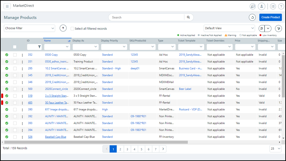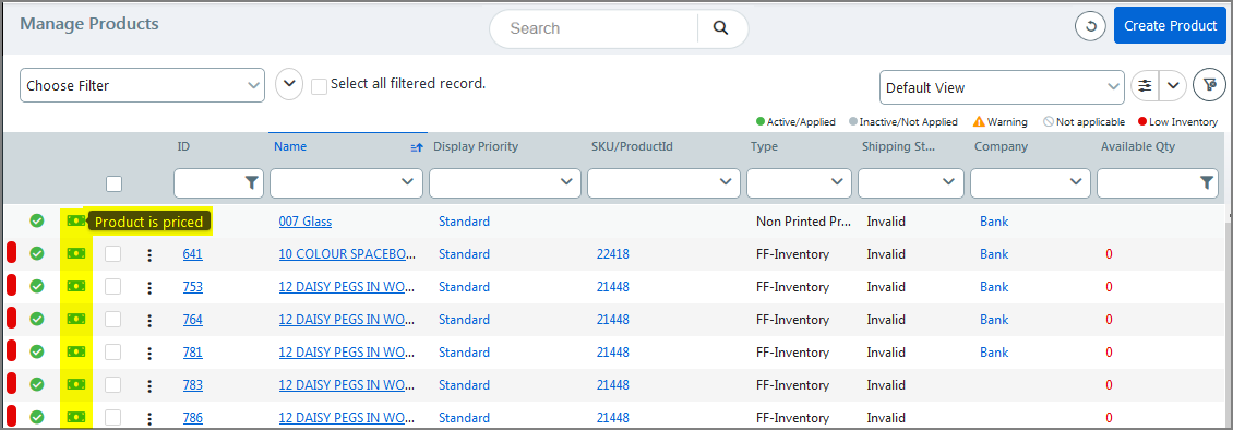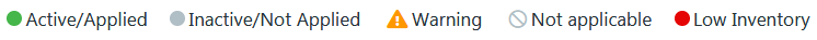 Hovering over any warning icon The Low Inventory icon will be present only on sites with the licensed MarketDirect Fulfillment option. |