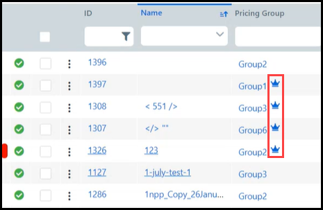 The pricing group assigned to the product. To filter on this attribute: In the column header field, select an option from the drop-down list. You can edit this field for each line item by clicking the pencil icon in the field and assigning a pricing group to the product in the Select Group window. For more information on Pricing Groups, see Edit_single_products_with_quick_access_links. |