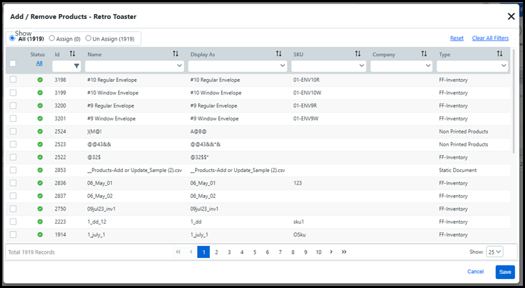 ● Locate the product(s) to assign from the Add / Remove Products window by using the search, sort, and filter options available for each column in the table.