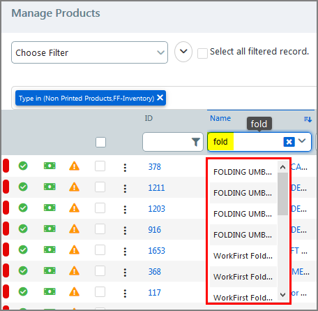 Name of the product. To filter on this attribute: In the column header field, enter a term or sequence of letters. Use the drop-down list in the column header field to limit results to a specified product type(s). |