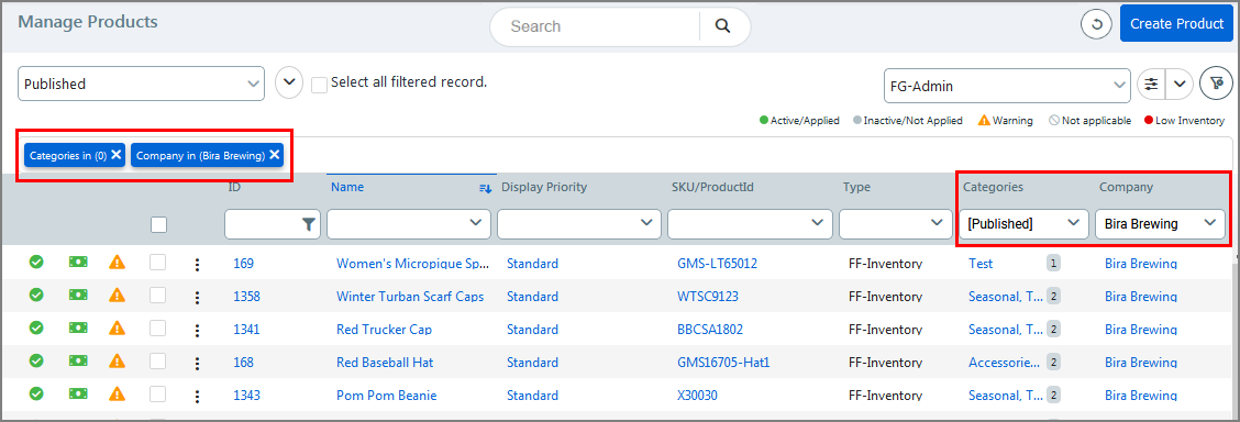 The categories to which the product is published. To filter on this attribute: In the column header field, select an option from the drop-down list. You can edit this field for each line item by clicking the pencil icon in the field and selecting categories in the Publish / Un-Publish window. |