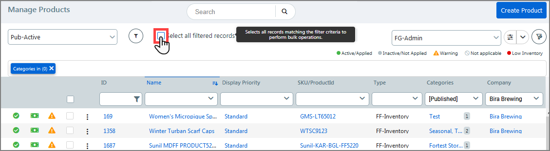 The bulk processing feature lets you manage large product data sets efficiently by executing various operations on all selected products in one pass. The bulk operations include: