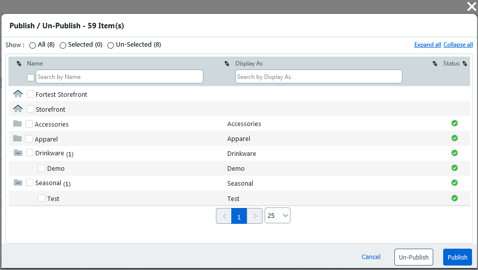 ● In the Show field, select the categories to show in the Publish / Un-Publish window: