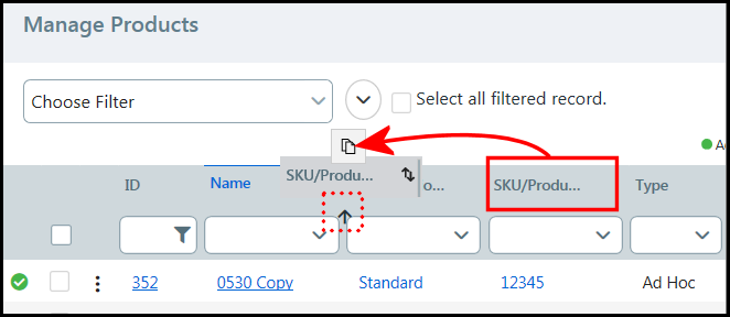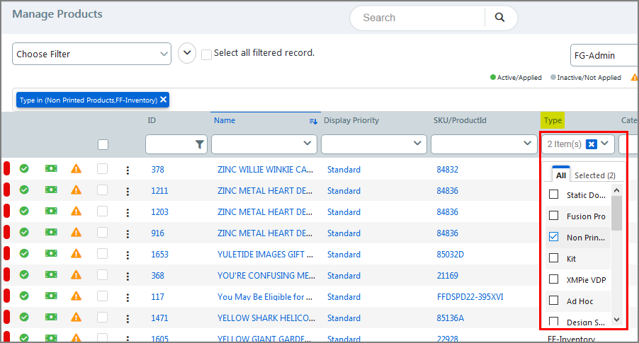 Type of product (ad hoc, non printed, kit, static, etc.). To filter on this attribute: In the column header field, select an option from the drop-down list. |