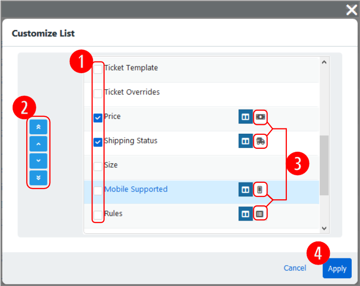 The name of the ticket template associated with the product. To filter on this attribute: In the column header field, select an option from the drop-down list. |