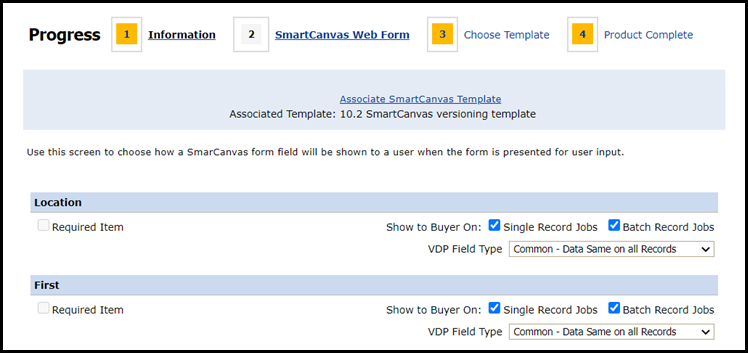● Click Assign Template. This will bring in all the fields defined in the selected template so you can map them with the web form buyers will complete when ordering the SmartCanvas product.
