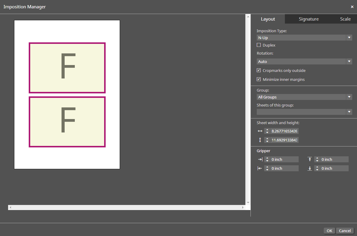 ● Step and Repeat (based on your specifications): A Step and Repeat imposition is used for printing multiple copies of the same page to fill a large sheet (typically with odd pages on the front and even pages on the back as with business cards).