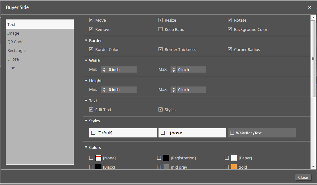 Buyers can use the product design tools to personalize products by selecting images from galleries and adding their own text, images, QR codes, and shapes.