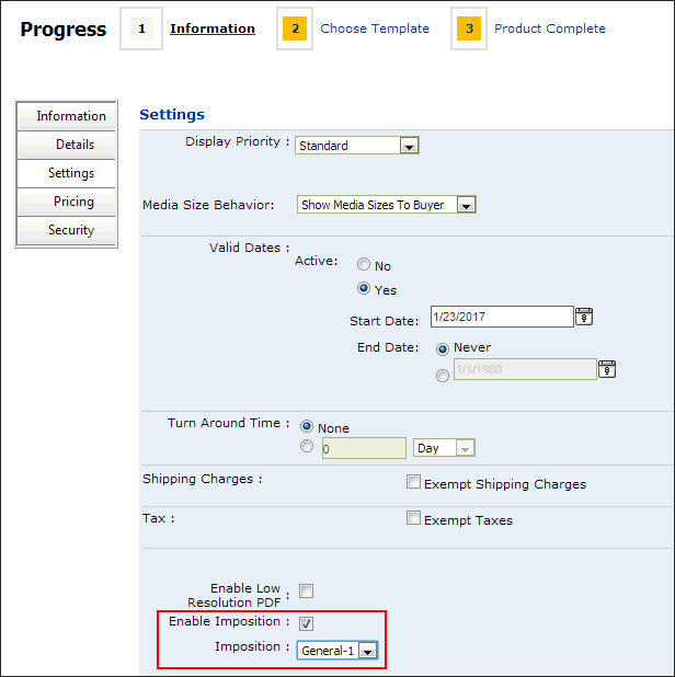 Important: The N-up and brochure imposition settings set in SmartCanvas are used only to define the production PDF for the product. For pricing purposes, configure the N-up settings to be consistent with the imposition you defined for the design template in the SmartCanvas designer.