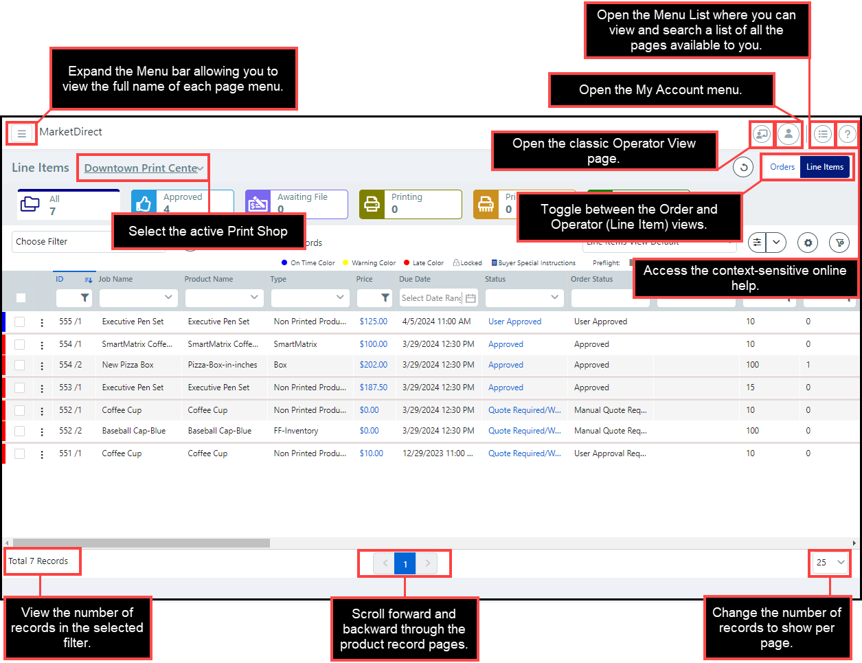 Toggle between the Operator View (Line Item View) and the Order View. |