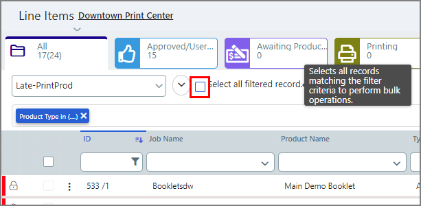 Notes on Filtering the Data in the Jobs Table Using Data Columns Adding Filters ● For fixed category data columns such as Product Type and Order Status, you can filter on any of the available options: ● Click the down arrow. ● Select one or more check boxes. ● For data columns with user-defined values such as Job Name, Product Name, Buyer Special Instructions, and Document, you can filter using partial or complete matches using like search terms entered directly in the field. ● Numerical value data columns (e.g., ID, Order Qty, Total Pages, etc.) can be filtered using operators. Any column with a filter can take value operators: ● For example, >450 will show all Product ID values greater than 450. ● Alphabetical value data columns (e.g., Job Name, Product Name, Document, etc.) can be filtered with like searches and will automatically begin filtering with every entered character. For example, a search for fold will return all job names that include the characters fold (i.e., fold, folders, folding, foldy, etc.). Removing Filters ● To