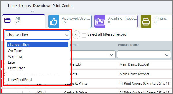 Output device associated with the job. To filter this attribute: In the column header field, select an option from the drop-down list. You can edit this attribute for each line item by clicking the pencil icon in the field and selecting an option from the drop-down list. |