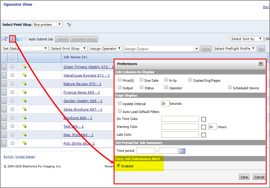 2 The Operator View opens to your system's default Print Shop. To change the target Print Shop, click the Print Shop link and select the Print Shop from the list.