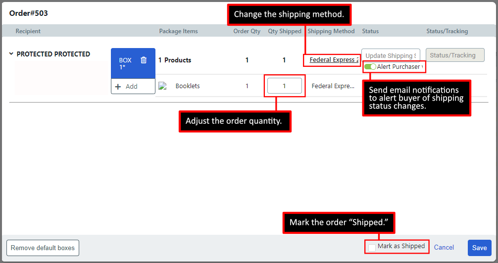 5 Check the box Alert Purchaser via E-mail to send an email notification to the buyer with the shipment tracking number.
